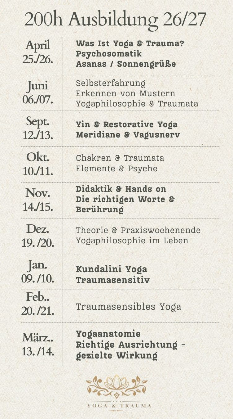 In unserer Ausbildung legen wir besonderen Fokus auf das Thema Yoga und Trauma. Wir glauben daran, dass Yoga nicht nur eine körperliche Praxis ist, sondern auch eine transformative Kraft besitzt, die uns dabei unterstützt, uns von unseren inneren Verletzungen zu befreien und ein erfülltes Leben zu führen.
